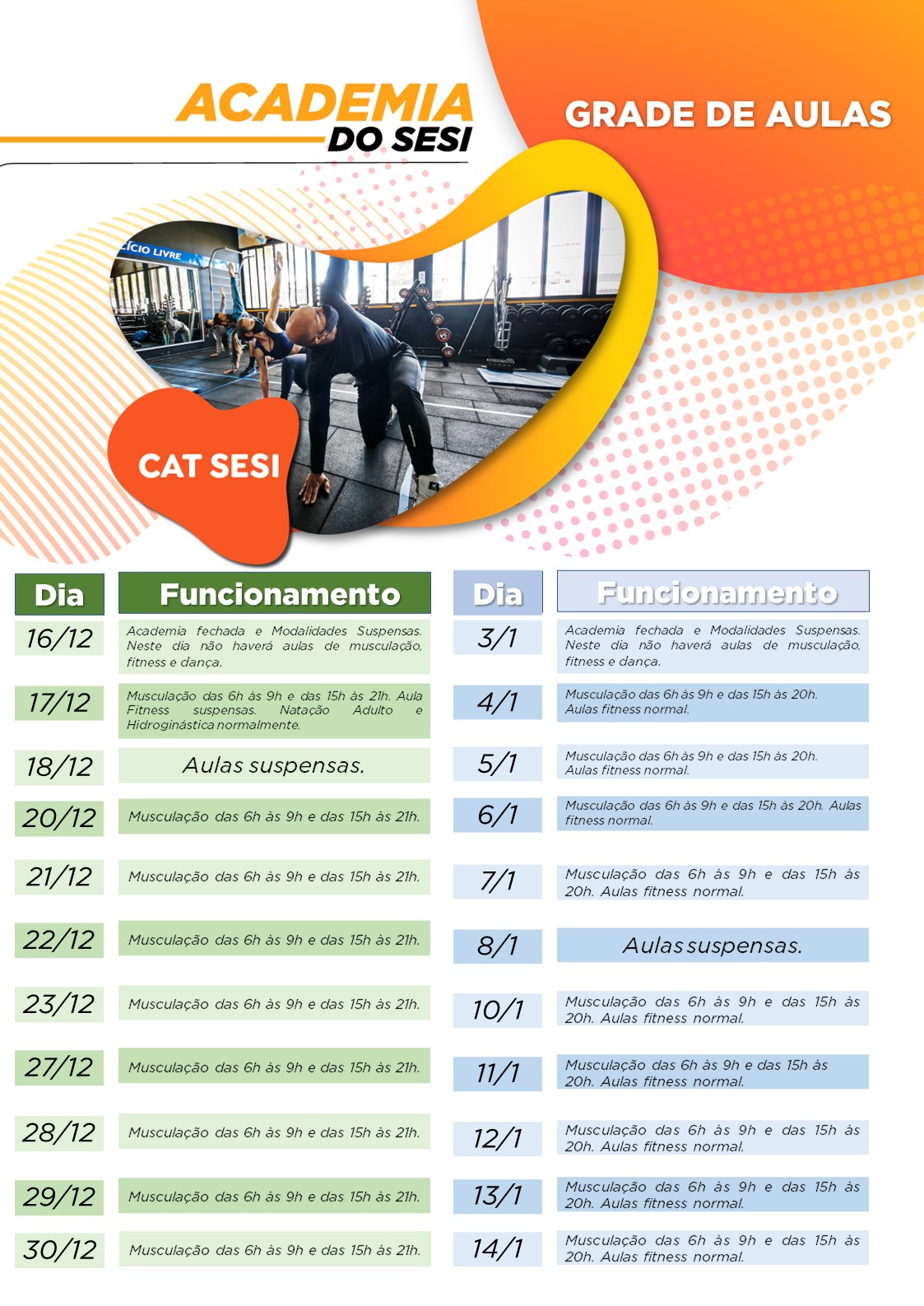 A época das festas e confraternizações chegou! No fim de ano a Academia do Sesi não para, porém o ritmo intenso dos treinos dá lugar a prática de exercícios físicos com foco na qualidade de vida para equilíbrio corporal e mental. Nos dias 24, 25 e 31 dezembro e 1º de janeiro o centro de atividades - CAT Sesi Rio Claro permancerá fechado. Confira o cronograma de dezembro e janeiro.