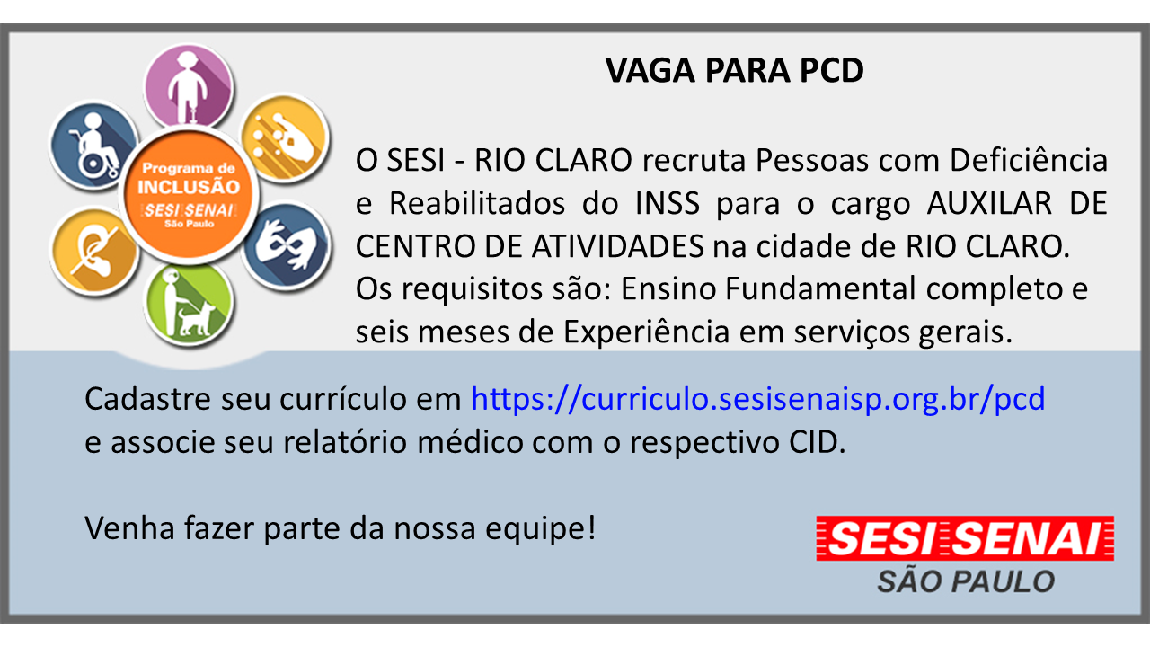 O SESI Rio Claro recruta Pessoas com Deficiência para a vaga de
